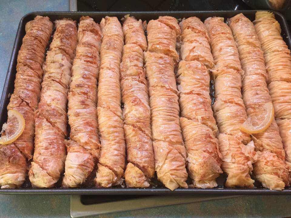 To assemble the dessert:Grease the baking pan and layer and drizzle butter between 5 phyllo sheets. The excess phyllo can go up the pan and the remaining can just hang outside the baking pan.
